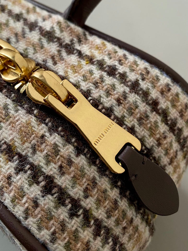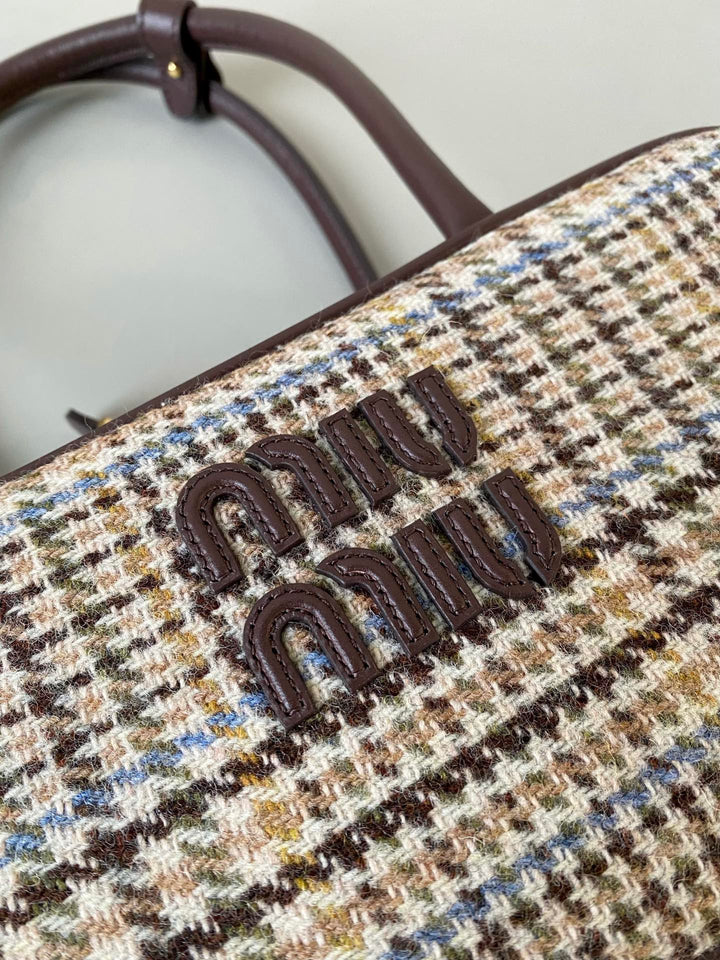 BEAU TOP HANDLE BAG 27 IN BEIGE TARTAN AND COCOA BROWN LEATHER TRIM
