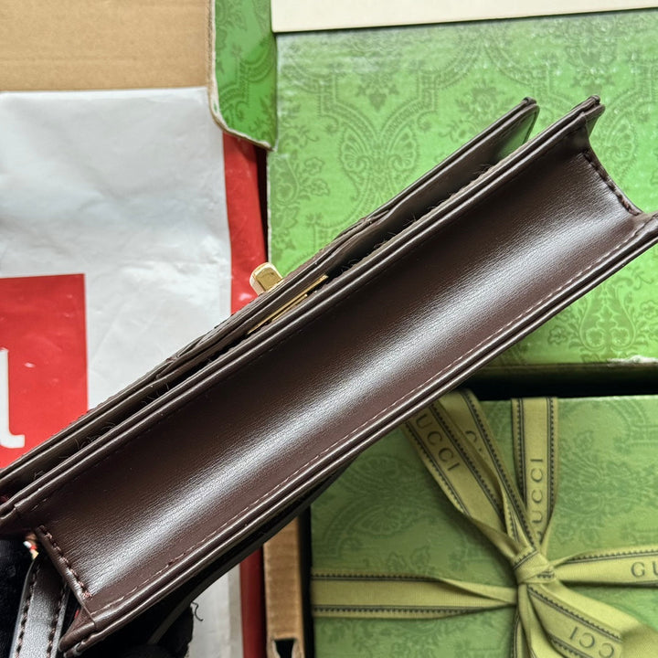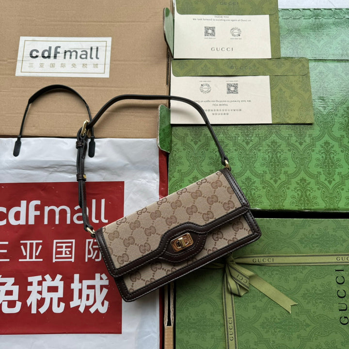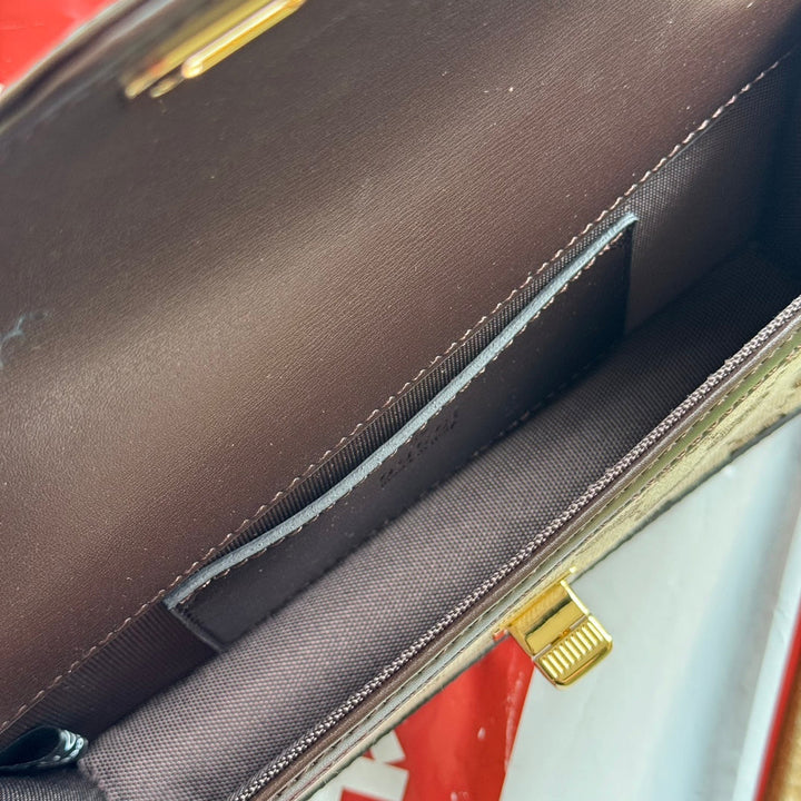 LUCE MINI SHOULDER BAG 20 IN BEIGE CANVAS AND DARK BROWN CALFSKIN TRIM GOLD HARDWARE