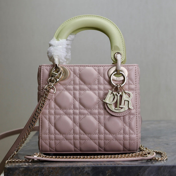 MINI LADY BAG 17 IN BABY PINK QUILTED MACROCANNAGE CALFSKIN SWAMP YELLOW STRAP