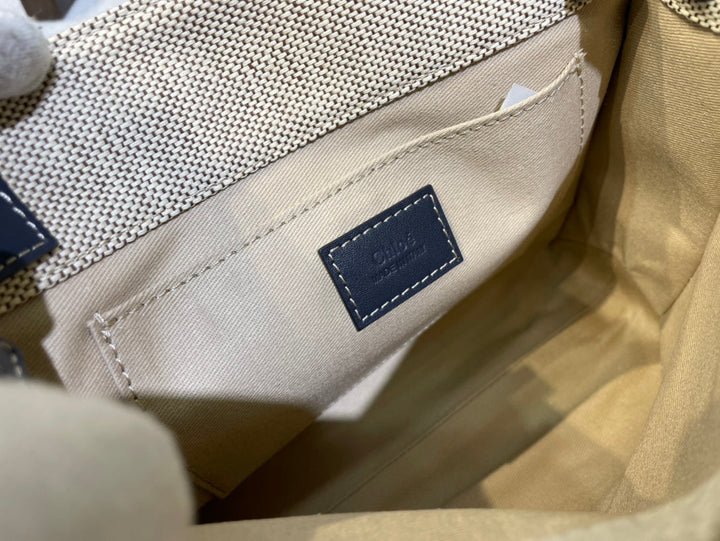 SMALL STRAP WOODY TOTE BAG 26.5 IN BEIGE LINEN CANVAS BLACK WEBBING DARK BLUE CALFSKIN