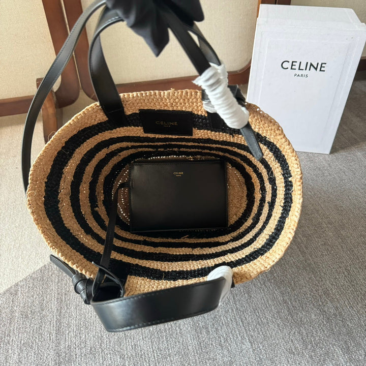 STRIPED COUFFIN CLASSIC PANIER 22 IN BEIGE AND BLACK RAFFIA AND CALFSKIN TRIM
